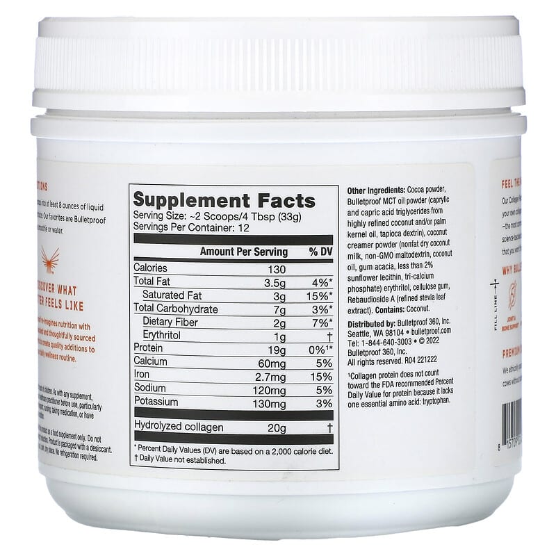 Collagen Peptides BulletProof hương sô cô la 14,3 oz (405 g) bổ sung collagen hỗ trợ sức khỏe da, tóc và khớp, vị ngon dễ uống., UPC 815709024390