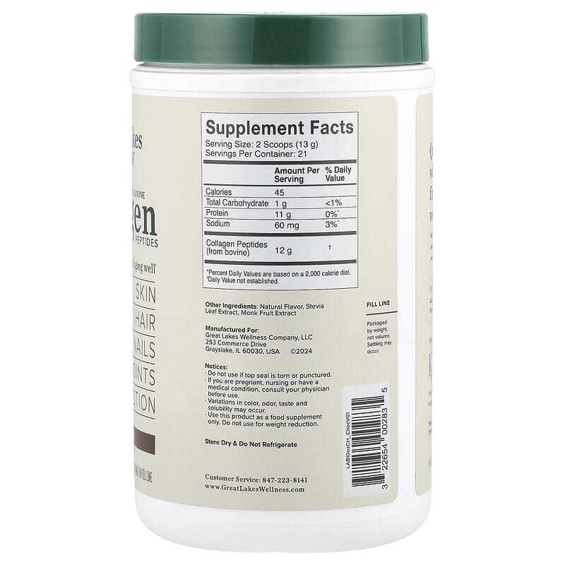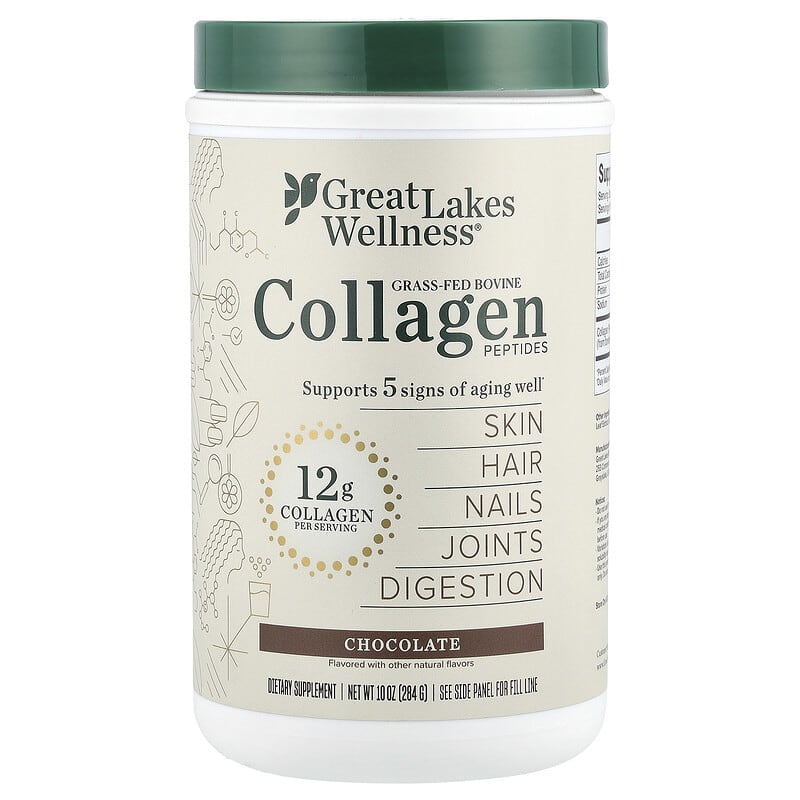 Giới thiệu sản phẩm Great Lakes Wellness Grass-Fed Bovine Collagen Peptides Chocolate 10 oz (284 g)