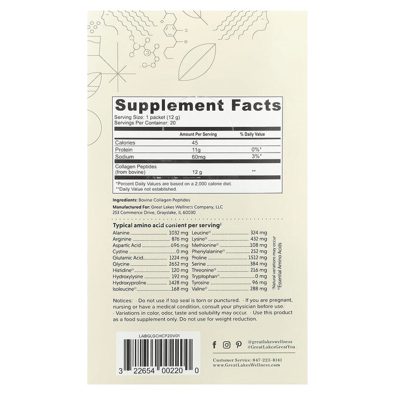 Giới thiệu sản phẩm Great Lakes Wellness Collagen Peptides Grass-Fed Bovine Unflavored 20 Packs 0,42 oz (12 g)