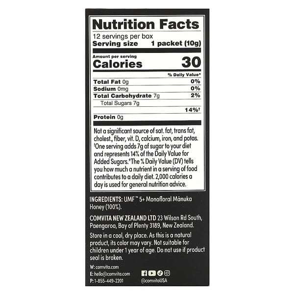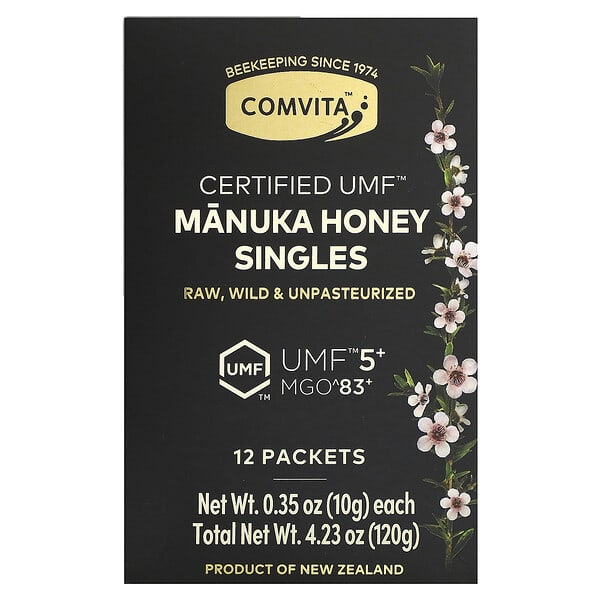 Thông tin sản phẩm Comvita, Manuka Honey Singles, UMF 5+, MGO 83+, 12 gói, 0,35 oz (10 g)