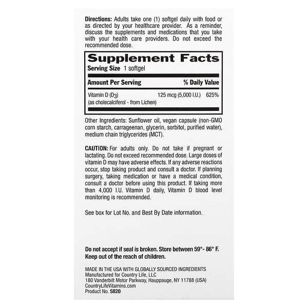 Thông tin sản phẩm Country Life, Certified Vegan D3, 125 mcg (5.000 IU), 30 viên mềm
