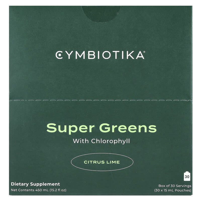 Cymbiotika Super Greens chứa chlorophyll hương chanh xanh, 30 gói 15 ml, hỗ trợ sức khỏe toàn diện, giải độc tự nhiên và tăng cường năng lượng., UPC 850025187152