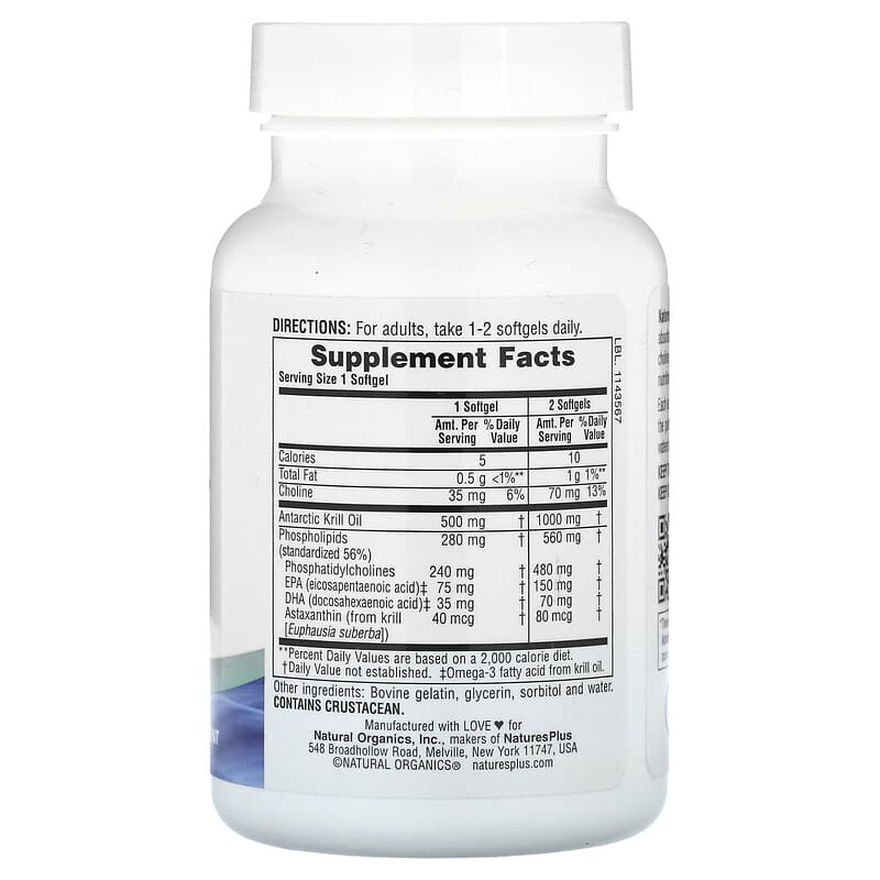 Mỗi viên nang mềm của NaturesPlus Antarctic Krill Oil chứa 500 mg dầu krill tinh khiết, cùng với các thành phần dinh dưỡng quan trọng như: