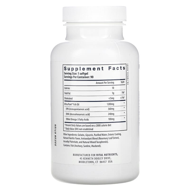 Dầu cá Ultra Pure 700mg Vital Nutrients giúp hỗ trợ sức khỏe tim mạch, cải thiện trí nhớ và tăng cường miễn dịch. 90 viên nang phủ enteic., UPC 693465445112