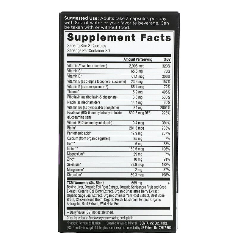 – TCM Women’s 40+ Blend: Gồm Bovine Liver, Organic Foti Root Extract, Organic Schisandra Fruit and Seed Extract, Organic Goji Berry Extract, Organic Chastetree Berry Extract, Organic Sage Leaf Extract, Organic Chinese Yam Root Extract, Beef Bone Broth, Chicken Bone Broth, Organic Reishi Mushroom Extract, Organic Astragalus Root Extract, Wild Hake Roe.