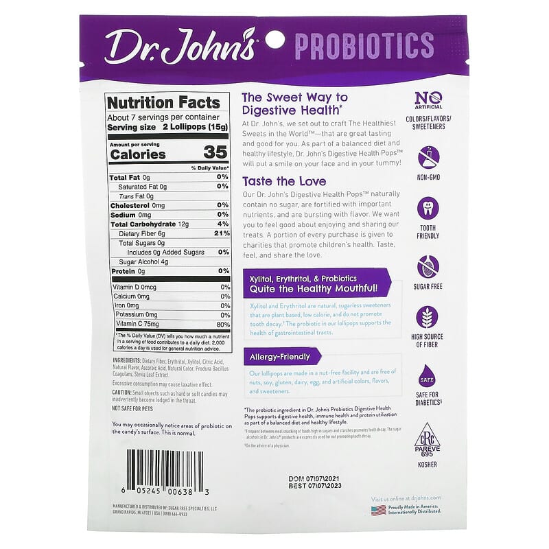 Kẹo mút Dr. John's không đường vị dâu đào táo, bổ sung chất xơ, vitamin C, men vi sinh, hỗ trợ tiêu hóa, 14 chiếc tiện lợi 3.85oz 605245006383