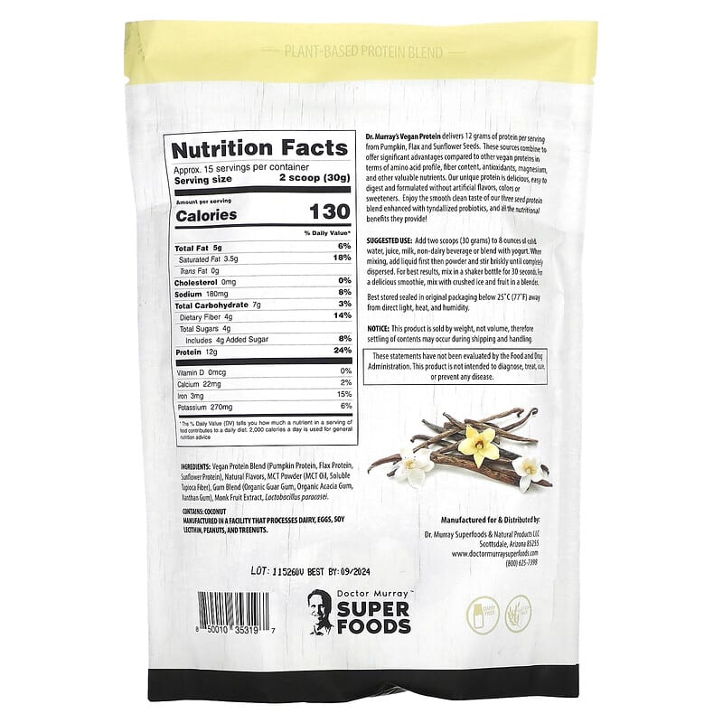 Giới thiệu sản phẩm Dr. Murray’s Super Foods 3 Seed (Pumpkin Flax Sunflower) Vegan Protein Powder Vanilla 16 oz (453.5 g)