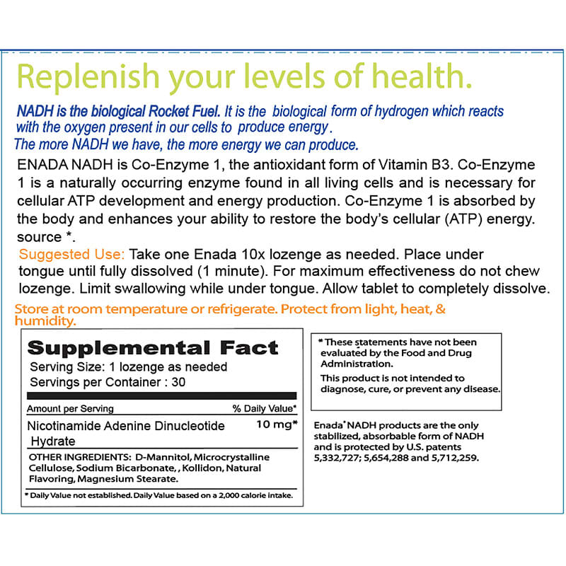 ENADA 10x chứa Nicotinamide Adenine Dinucleotide Hydrate (NADH), một dạng coenzym tự nhiên có vai trò quan trọng trong quá trình sản xuất năng lượng của tế bào. Sản phẩm này được biết đến như một “nhiên liệu sinh học” giúp cơ thể sản xuất ATP (Adenosine Triphosphate), nguồn năng lượng chính cho các hoạt động sống của tế bào.