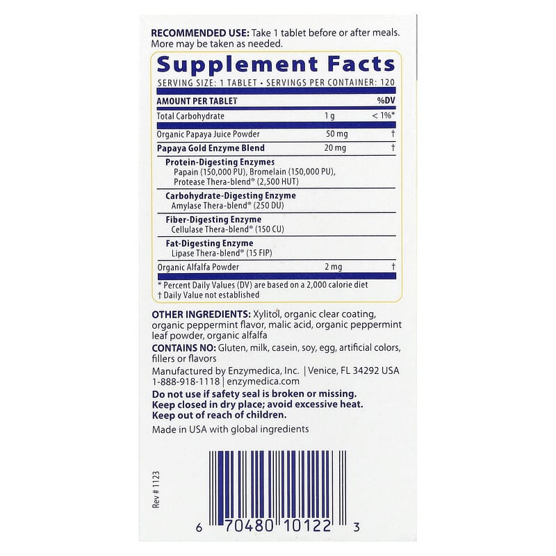 Enzymedica Papaya Gold Bạc Hà 120 viên hỗ trợ tiêu hóa, giảm đầy hơi, mang lại cảm giác thoải mái sau bữa ăn., UPC 670480101223