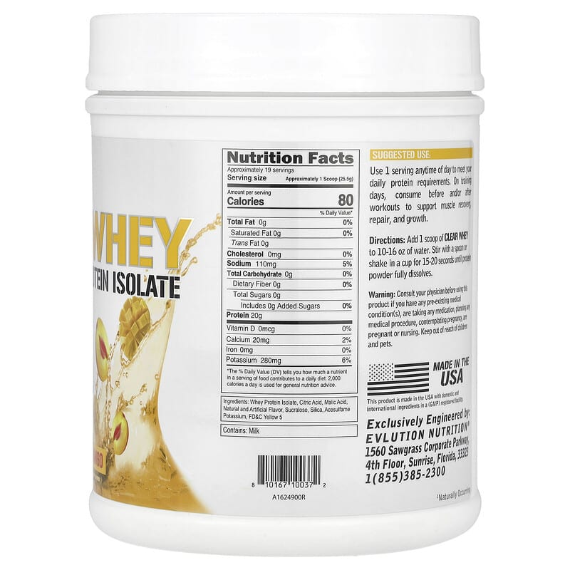 Bột protein whey tinh khiết EVLution Nutrition hương đào xoài 100% whey protein isolate 1,1 lb giúp tăng cường cơ bắp, hỗ trợ phục hồi., UPC 810167100372