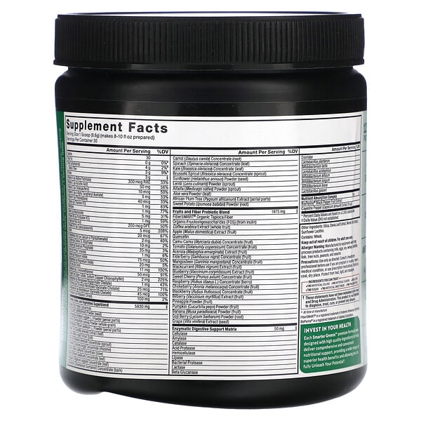 Smarter Greens chứa hơn 40 loại siêu thực phẩm cùng với 25 vitamin và khoáng chất thiết yếu, bao gồm: