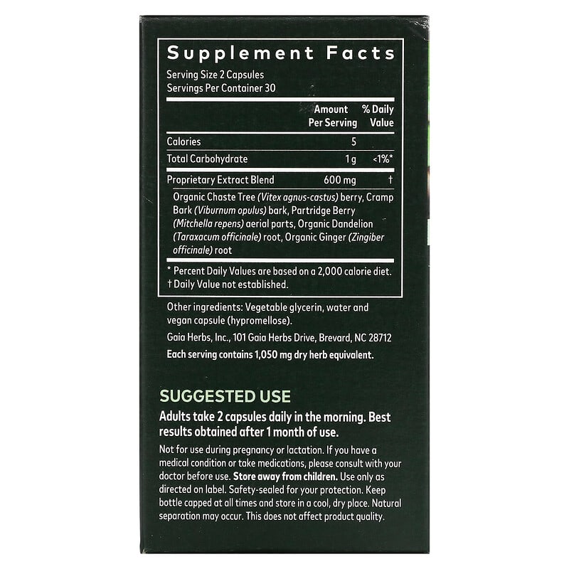 Proprietary Extract Blend Organic Chaste Tree (Vitex agnus-castus) berry, Cramp Bark (Viburnum opulus) bark, Partridge Berry (Mitchella repens) aerial parts, Organic Dandelion (Taraxacum officinale) root, organic ginger (zingiber officinale) root | 600 mg | † |