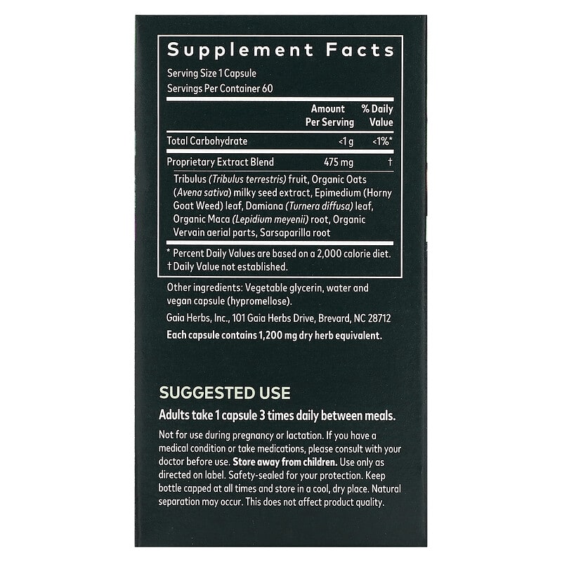 Proprietary Extract Blend Tribulus (Tribulus terrestris) fruit, Organic Oats (Avena sativa) milky seed extract, Epimedium (Horny Goat Weed) leaf, Damiana (Turnera diffusa) leaf, Organic Maca (Lepidium meyenii) root, Organic Vervain aerial parts, Sarsaparilla root | 475 mg | † |