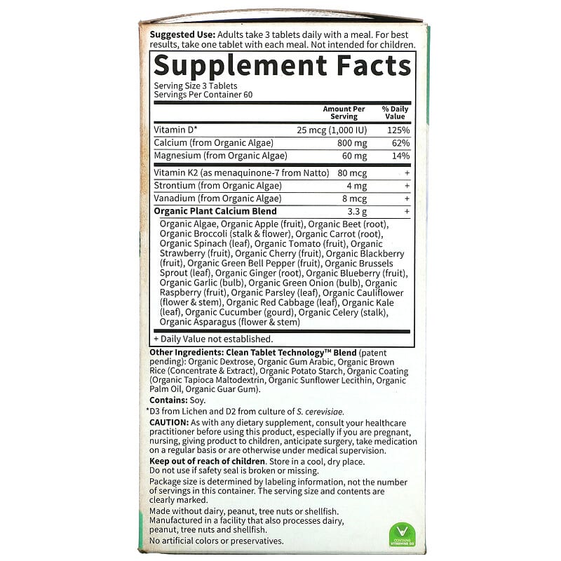 Organic Plant Calcium Blend Organic Algae, Organic Apple (fruit), Organic Beet (root), Organic Broccoli (stalk & flower), Organic Carrot (root), Organic Spinach (leaf), Organic Tomato (fruit), Organic Strawberry (fruit), Organic Cherry (fruit), Organic Blackberry (fruit), Organic Green Bell Pepper (fruit), Organic Brussels Sprout (leaf), Organic Ginger (root), Organic Blueberry (fruit), Organic Garlic (bulb), Organic Green Onion (bulb), Organic Raspberry (fruit), Organic Parsley (leaf), Organic Cauliflower (flower & stem), Organic Red Cabbage (leaf), Organic Kale (leaf), Organic Cucumber (gourd), Organic Celery (stalk), Organic Asparagus (flower & stem) | 3.3 g | + |