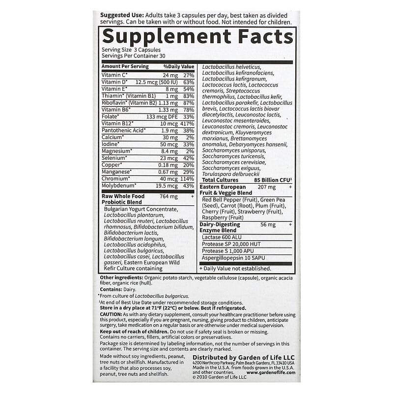 RAW Whole Food Probiotic Blend Bulgarian Yogurt Concentrate, Lactobacillus plantarum, Lactobacillus reuteri, Lactobacillus rhamnosus, Bifidobacterium bifidum, Bifidobacterium lactis, Bifidobacterium longum, Lactobacillus acidophilus, Lactobacillus bulgaricus, Lactobacillus casei, Lactobacillus gasseri, Eastern European Wild Kefir Culture containing Lactobacillus helveticus, Lactobacillus kefiranofaciens, Lactobacillus kefirgranum, Lactococcus lactis, Lactococcus cremoris, Streptococcus thermophilus, Lactobacillus kefir, Lactobacillus parakefir, Lactobacillus brevis, Lactococcus lactis biovar diacetylactis, Leuconostoc lactis, Leuconostoc mesenteroides, Leuconostoc cremoris, Leuconostoc dextranicum, Kluyveromyces marxianus, Brettanomyces anomalus, Debaryomyces hansenii, Saccharomyces unisporus, Saccharomyces turicensis, Saccharomyces cerevisiae, Saccharomyces exiguus, Torulaspora delbrueckii Total Cultures | 764 mg 85 Billion CFU¹ | + |