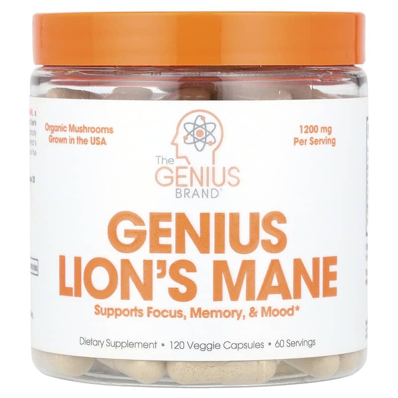 Viên uống Genius Lion's Mane 1200 mg hỗ trợ tăng cường trí nhớ và sức khỏe não bộ, sản phẩm chất lượng từ The Genius Brand., UPC 810037681185