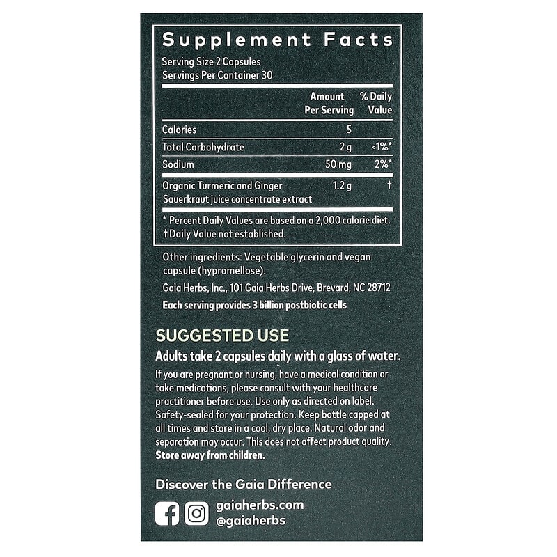 Viên uống postbiotic Gừng Nghệ Gaia Herbs hỗ trợ tiêu hóa, tăng cường sức khỏe, 60 viên giúp bạn khỏe mạnh mỗi ngày., UPC 751063153461