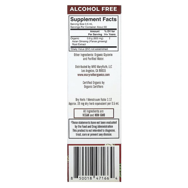 Chiết xuất rễ nhân sâm Hàn Quốc hữu cơ MaryRuth's 30 ml tăng cường sức khỏe, hỗ trợ năng lượng và miễn dịch tự nhiên., UPC 850018471664