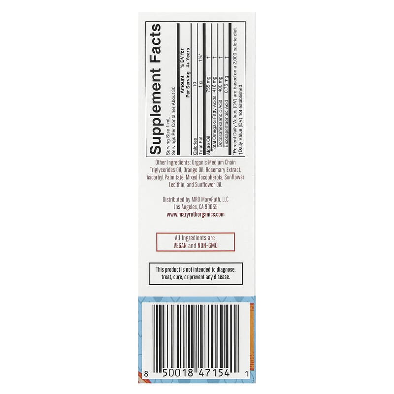 Giọt Omega-3 Thực Vật MaryRuth's Hương Cam 30ml hỗ trợ sức khỏe tim mạch và não bộ, dễ sử dụng và hấp dẫn., UPC 850018471541