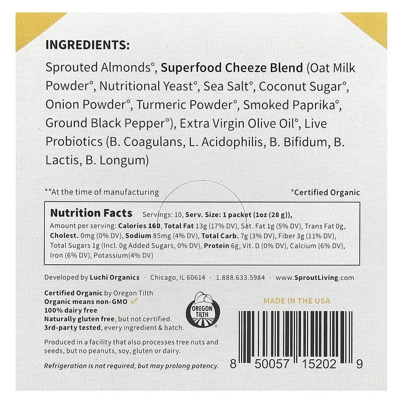 Giới thiệu sản phẩm Sprout Living Probiotic Almonds Cheddar Cheeze 10 gói 1 oz (28 g)