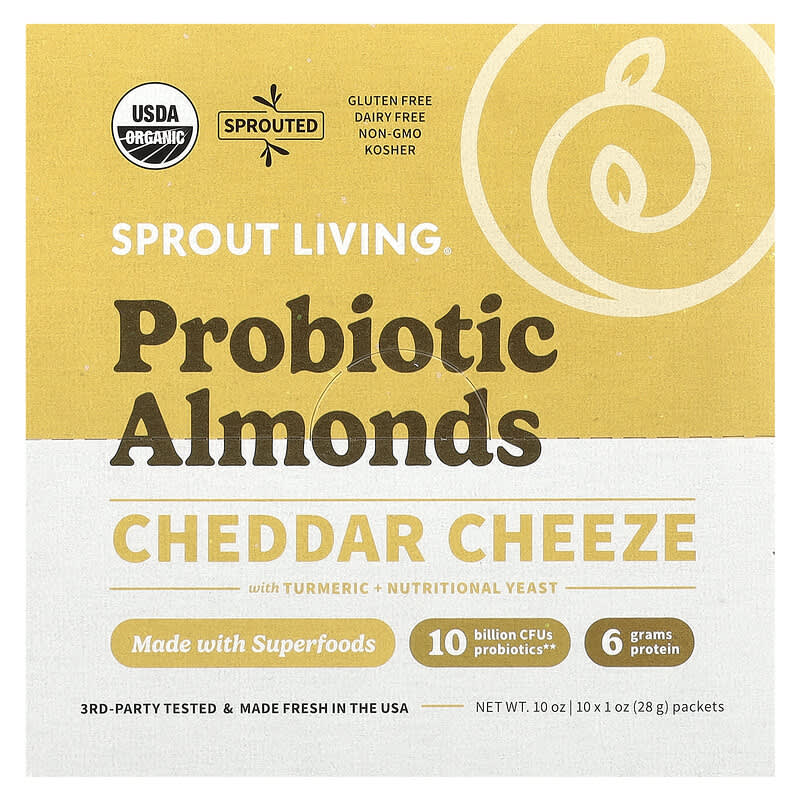 Hạt hạnh nhân probiotic vị phô mai cheddar Sprout Living, 10 gói, 28 g, bổ sung lợi khuẩn, ngon miệng, tốt cho sức khỏe., UPC 850057152029