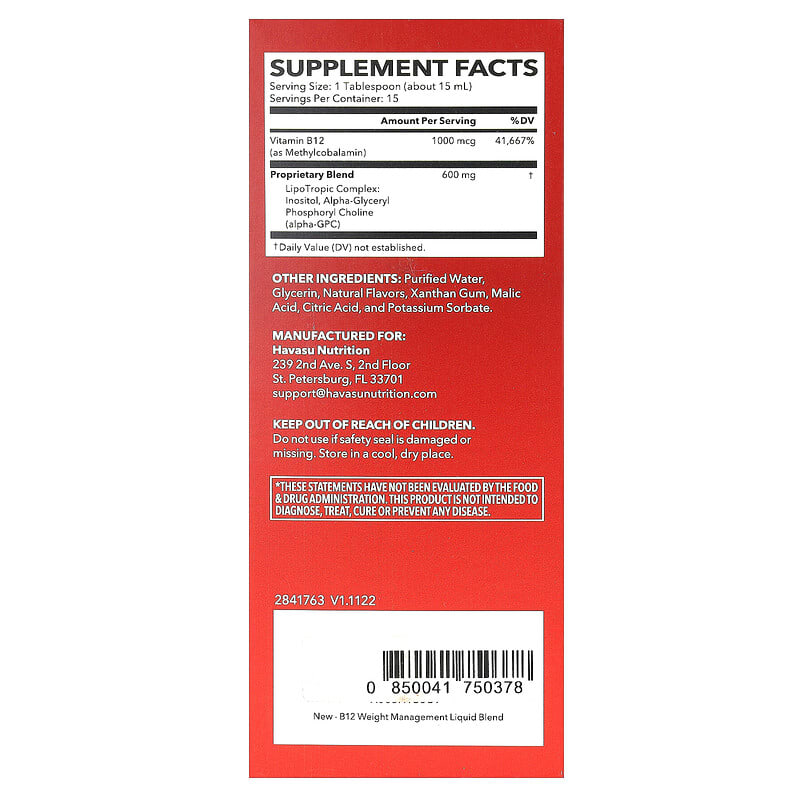Havasu Nutrition Vitamin B12 giảm cân dạng lỏng vị berry 225ml, hỗ trợ năng lượng, tăng cường trao đổi chất., UPC 850041750378