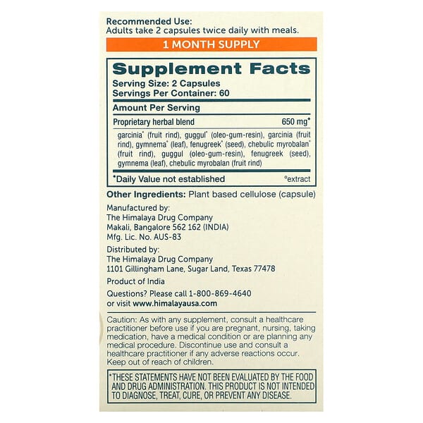 Proprietary herbal blend garcinia° (fruit rind), guggul° (oleo-gum-resin), garcinia (fruit rind), gymnema° (leaf), fenugreek° (seed), chebulic myrobalan° (fruit rind), guggul (oleo-gum-resin), fenugreek (seed), gymnema (leaf), chebulic myrobalan (fruit rind) | 650 mg | ♦ |