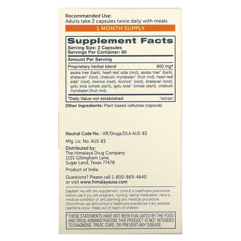Proprietary herbal blend asoka tree (bark), heart-leaf side (root), asoka tree° (bark), shatavari° (root), chebulic myrobalan° (fruit rind), heart-leaf sida° (root), licorice (root), licorice° (root), shatavari (root), gotu kola (whole plant), gotu kola° (whole plant), chebulic myrobalan (fruit rind). | 800 mg | * |