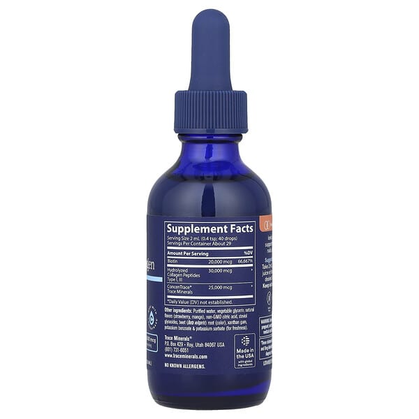 Thông tin sản phẩm Trace Minerals ®, Ionic Biotin + Collagen, Strawberry Mango, 75.000 mcg, 2 fl oz (59 ml)
