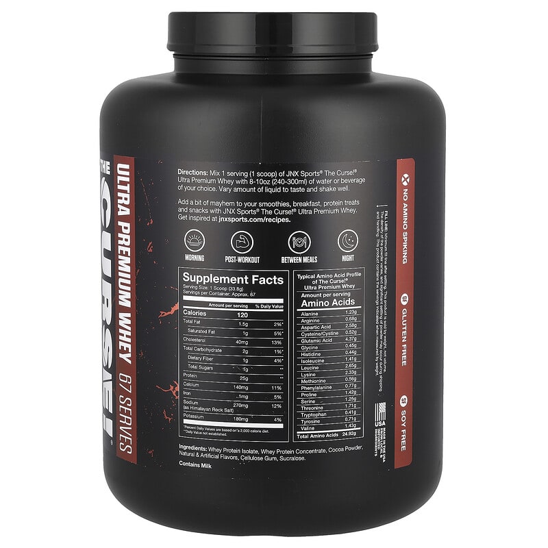 JNX Sports The Curse!® Ultra Premium Whey được chiết xuất chủ yếu từ Whey Protein Isolate (WPI) và Whey Protein Concentrate (WPC). Mỗi khẩu phần (1 muỗng 33,8g) cung cấp tới 25g protein, giúp cơ thể hấp thụ nhanh chóng và hiệu quả. Bên cạnh đó, sản phẩm còn chứa 5.5g BCAA (các axit amin chuỗi nhánh) tự nhiên, hỗ trợ quá trình phục hồi và tăng cường sức bền trong tập luyện.