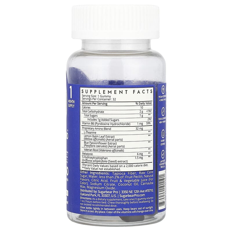Kẹo dẻo 5-HTP Amino SugarbearPro giúp ngủ ngon, thư giãn tâm trí, an toàn cho sức khỏe, 32 viên tiện lợi., UPC 850044101191