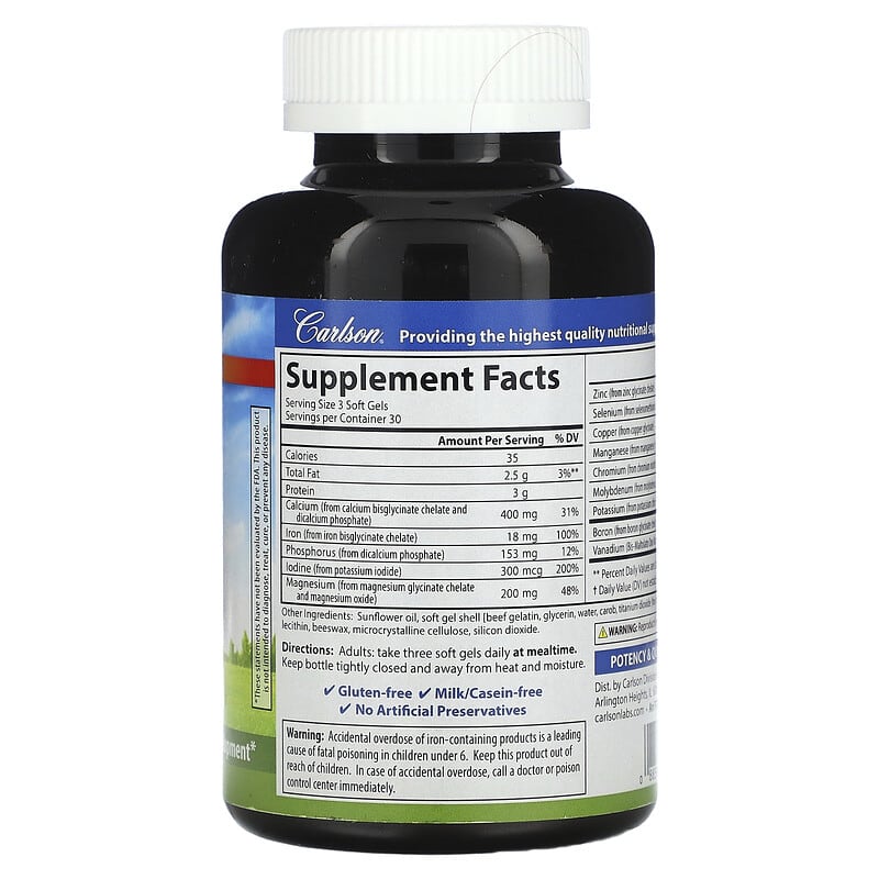 Carlson Chelated Minerals chứa một công thức độc đáo với các khoáng chất được chelat hóa, giúp tăng cường khả năng hấp thu của cơ thể. Mỗi liều dùng (3 viên nang mềm) cung cấp các thành phần sau: