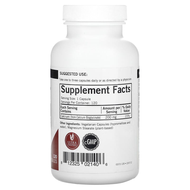 Chelate Canxi Bisglycinate 200 mg hỗ trợ sức khỏe xương, 120 viên dễ hấp thụ, an toàn cho cơ thể., UPC 812325021406