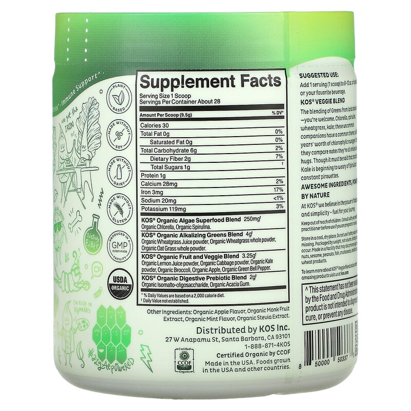 KOS® Organic Fruit and Veggie Blend Organic Lemon juice powder, Organic Cabbage powder, Organic Kale powder, Organic Broccoli, Organic Apple, Organic Green Bell Pepper. | 3.25 g | † |