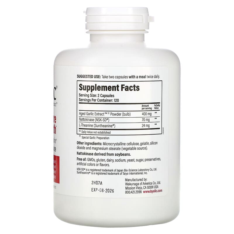Kyolic Aged Garlic Extract Blood Pressure Health Formula 109 240 Capsules là một sản phẩm bổ sung dinh dưỡng tự nhiên, giúp hỗ trợ sức khỏe huyết áp và tim mạch hiệu quả. Với ba thành phần chính là Aged Garlic Extract™, Nattokinase và L-Theanine, sản phẩm không chỉ giúp ổn định huyết áp mà còn mang lại nhiều lợi ích cho sức khỏe tổng thể. Để đạt được hiệu quả tốt nhất, người dùng nên tuân thủ hướng dẫn sử dụng và lưu ý các điều kiện khi sử dụng. Hãy chăm sóc sức khỏe của bạn và gia đình ngay hôm nay với Kyolic Aged Garlic Extract!