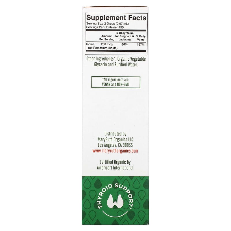 Sản phẩm MaryRuth Organics Organic Iodine Liquid Drops cung cấp 250 mcg iodine cho mỗi 2 giọt, tương đương với 167% giá trị hàng ngày. Iodine rất cần thiết cho việc sản xuất hormone tuyến giáp, ảnh hưởng đến quá trình trao đổi chất, năng lượng cơ thể và sự phát triển của tế bào. Việc bổ sung iodine giúp cải thiện chức năng tuyến giáp, hỗ trợ quá trình trao đổi chất và bảo vệ sức khỏe tổng thể.