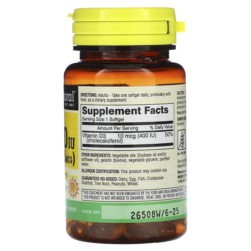 Mason Natural Vitamin D3 10 mcg (400 IU) được đóng gói với 100 viên softgel, mỗi viên chứa: