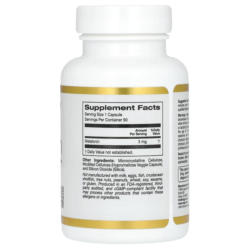 Mỗi viên nang California Gold Nutrition Melatonin chứa 3 mg melatonin, một hormone tự nhiên được sản xuất bởi tuyến tùng trong não. Melatonin đóng vai trò quan trọng trong việc điều chỉnh chu kỳ giấc ngủ và thức. Ngoài melatonin, sản phẩm còn chứa các thành phần khác như: