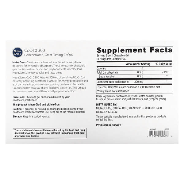 CoQ10 300 Metagenics NutraGems 30 viên nhai, sản phẩm chính hãng nhập khẩu từ Mỹ, hỗ trợ sức khỏe tim mạch và năng lượng., UPC: 755571930637