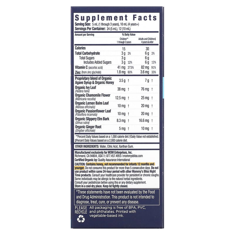 Giới thiệu sản phẩm Mommy’s Bliss Kids Organic Cough Syrup & Mucus Night Time 1-12 Yrs 4 fl oz (120 ml)