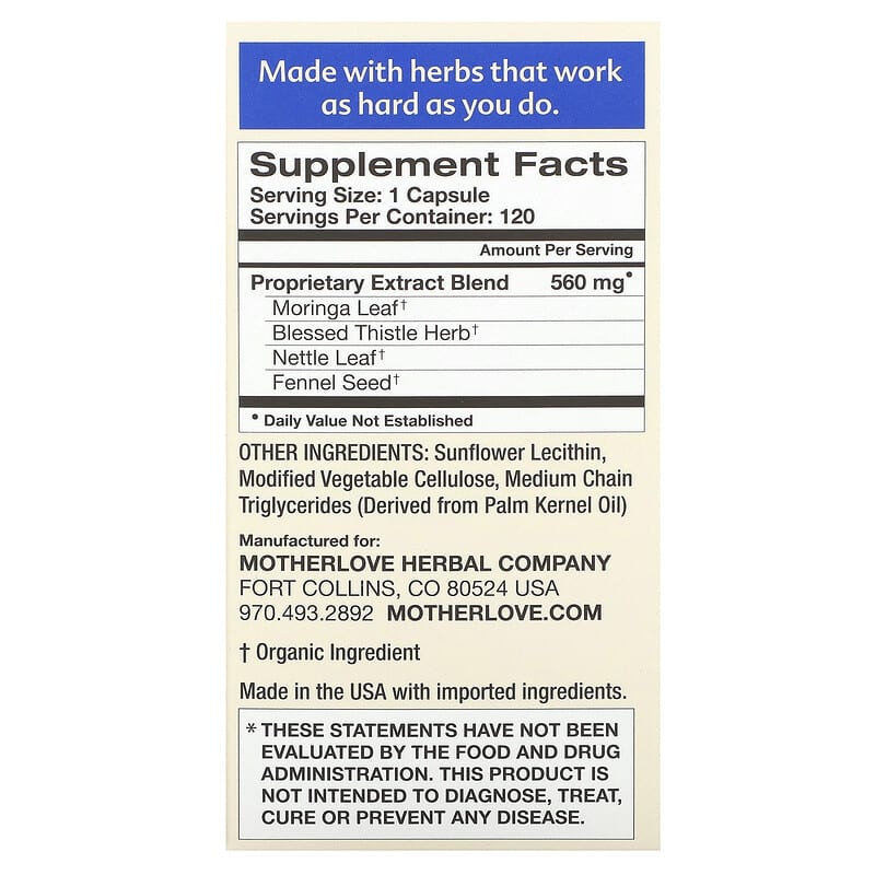 Motherlove Breastfeeding More Milk Moringa chứa các thành phần tự nhiên, được chứng nhận là không biến đổi gen (Non-GMO), thuần chay (Vegan) và phù hợp với người ăn kiêng Kosher. Sản phẩm được tạo thành từ các loại thảo mộc có tác dụng hỗ trợ sản xuất sữa mẹ, bao gồm: