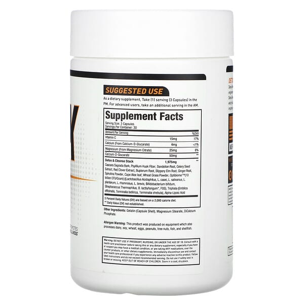 Detox & Cleanse Stack Cascara Sagrada Bark, Psyllium Husk Fiber, Dandelion Root, Celery Seed Extract, Red Clover Extract, Bupleurum Root, Slippery Elm Root, Ginger Root, Spirulina Powder, Cape Aloe leaf, Wheat Grass Powder, Optibiome™(10 billion CFU/Gram) ((Lactobacillus Acidophilus, L. casei, L. salivarius, L. plantarum, L. rhamnosus, L brevis, Bifidobacterium bifidum, Streptococcus Thermophilus, B. lactis/longum*, FOS), Triphala (Emblica officinalis, Terminalia bellirica, Terminalia chebula), Alpha-Lipoic Acid. | 1,975 mg | ** |