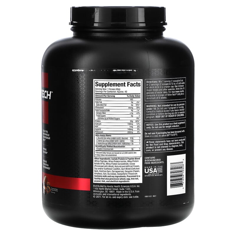 – Protein whey: NitroTech được chiết xuất từ whey protein peptides và whey protein isolate, hai nguồn protein tinh khiết và chất lượng cao.