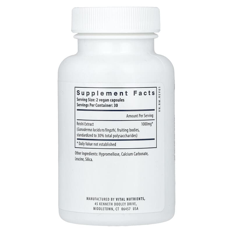 Vital Nutrients Reishi Mushroom chứa 1000 mg chiết xuất nấm linh chi (Ganoderma lucidum) từ thân quả, được tiêu chuẩn hóa với 30% polysaccharides tổng hợp. Polysaccharides là các hợp chất tự nhiên có khả năng kích thích và điều chỉnh hoạt động của hệ miễn dịch. Ngoài ra, sản phẩm còn chứa các thành phần khác như hypromellose (vỏ viên nang thực vật), calcium carbonate, leucine và silica.