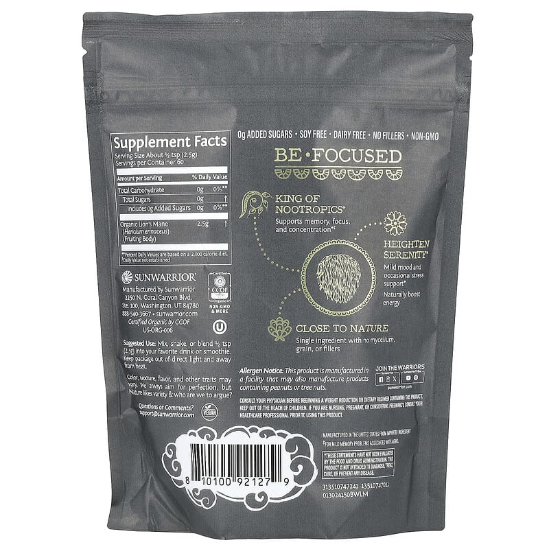 Nấm Lion's Mane Hữu Cơ Sunwarrior Be Well 150g tăng cường sức khỏe, hỗ trợ não bộ, an toàn và tự nhiên cho mọi gia đình., UPC 810100921279