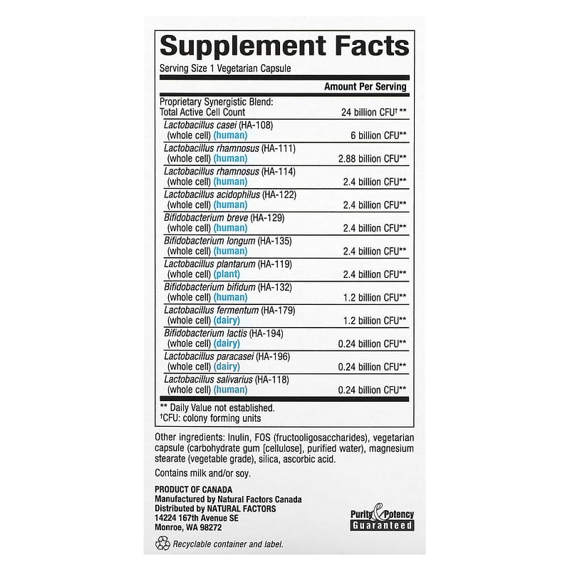 Natural Factors Ultimate Probiotic 24/12 Formula chứa 12 chủng lợi khuẩn khác nhau, mỗi loại đều đã được nghiên cứu và chọn lọc kỹ lưỡng: