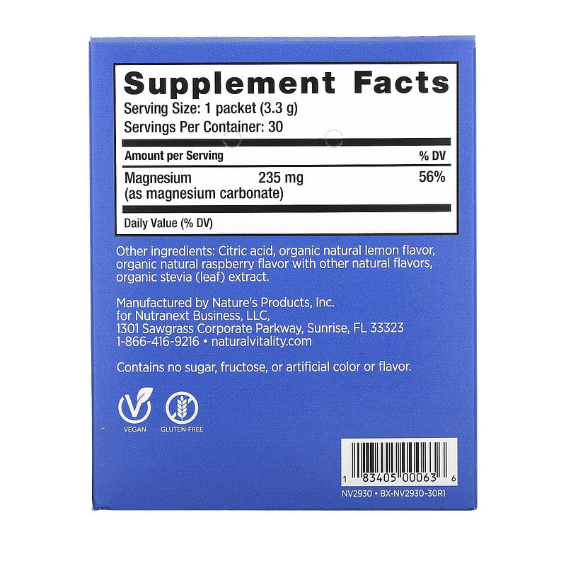 – Magiê (dưới dạng magiê carbonate): 235 mg mỗi gói, chiếm 56% giá trị hàng ngày. Magiê là khoáng chất quan trọng giúp thư giãn cơ bắp và cải thiện tâm trạng.