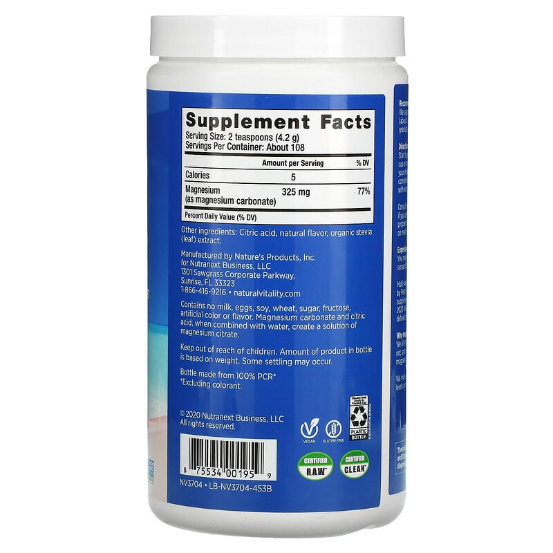 – Magnesium Carbonate: 325 mg mỗi khẩu phần, tương đương 77% giá trị hàng ngày. Đây là thành phần chính giúp bổ sung magnesium cho cơ thể.