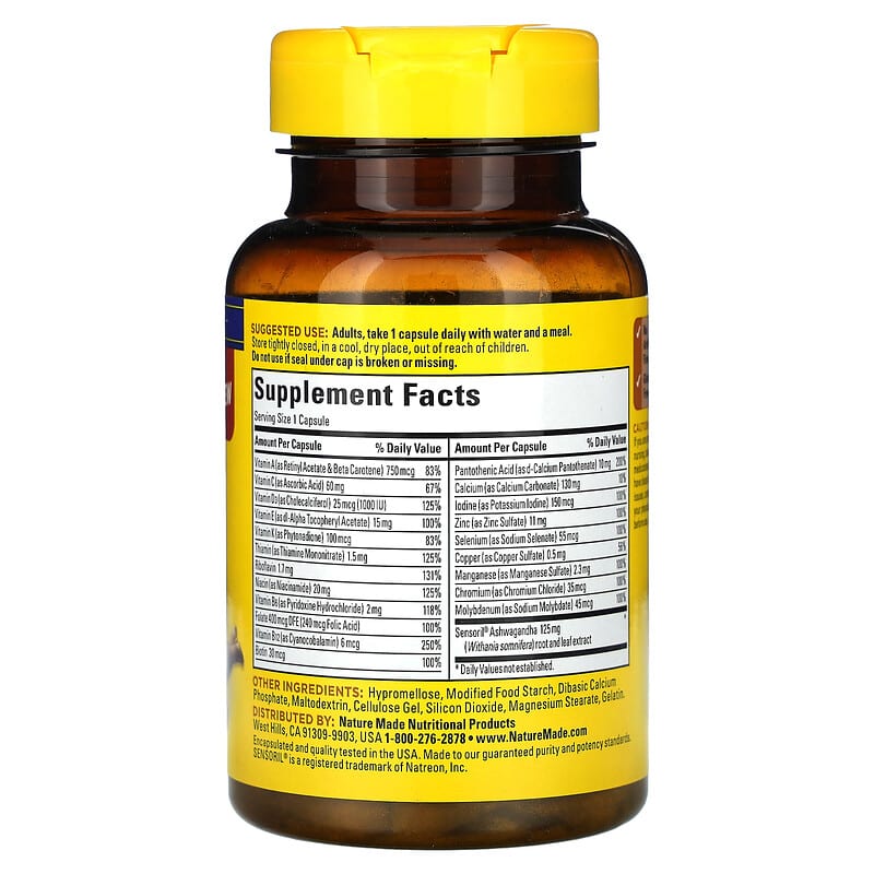 Viên uống Nature Made Multi + Ashwagandha hỗ trợ sức khỏe tổng thể, giảm căng thẳng, tăng cường năng lượng, 60 viên., UPC 031604002572