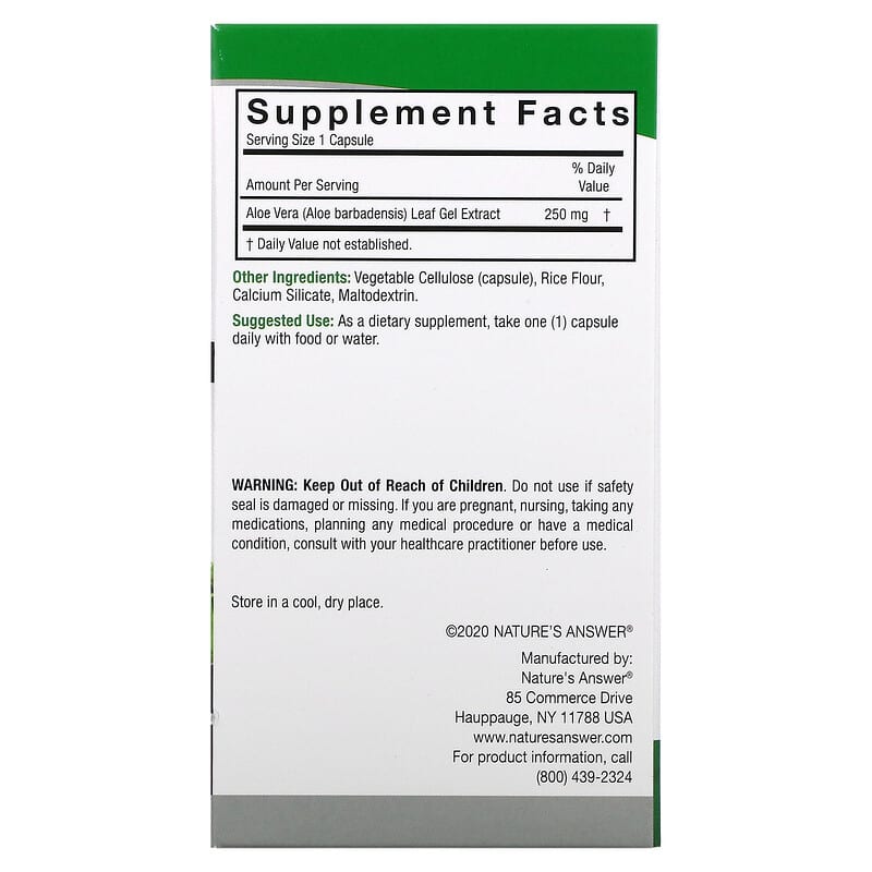 Nature’s Answer Aloe Vera Phytogel là một sản phẩm bổ sung dinh dưỡng đến từ thương hiệu nổi tiếng Nature’s Answer, được thành lập từ năm 1972. Sản phẩm này chứa chiết xuất gel lá lô hội (Aloe Barbadensis) với hàm lượng 250 mg trong mỗi viên nang, giúp hỗ trợ sức khỏe tiêu hóa và nâng cao sức khỏe tổng thể.